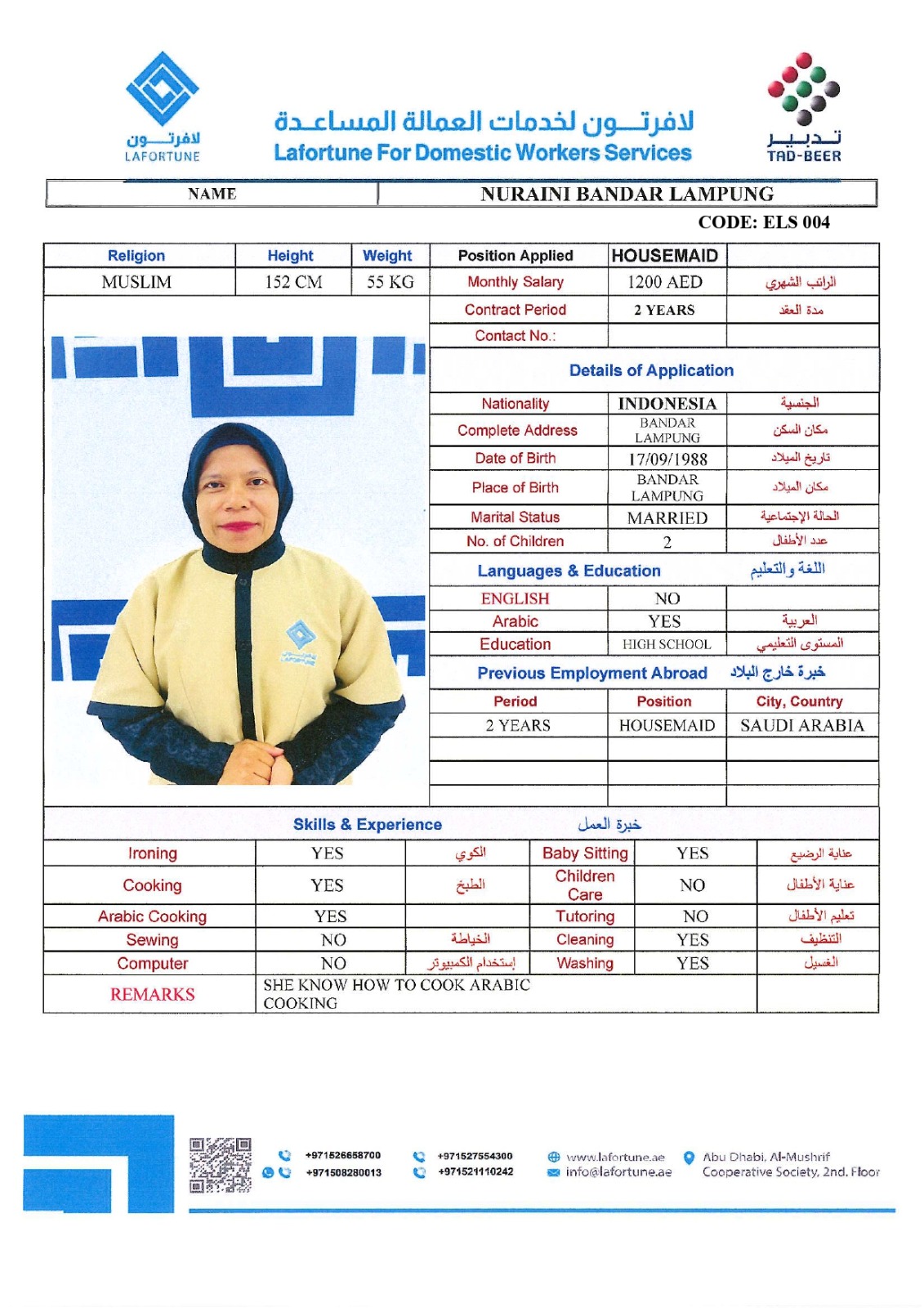 SKU: ELS 004 Category: INDONESIA Tags: Arabic Cooking, Baby Sitting, Cleaning, Cooking, Washing